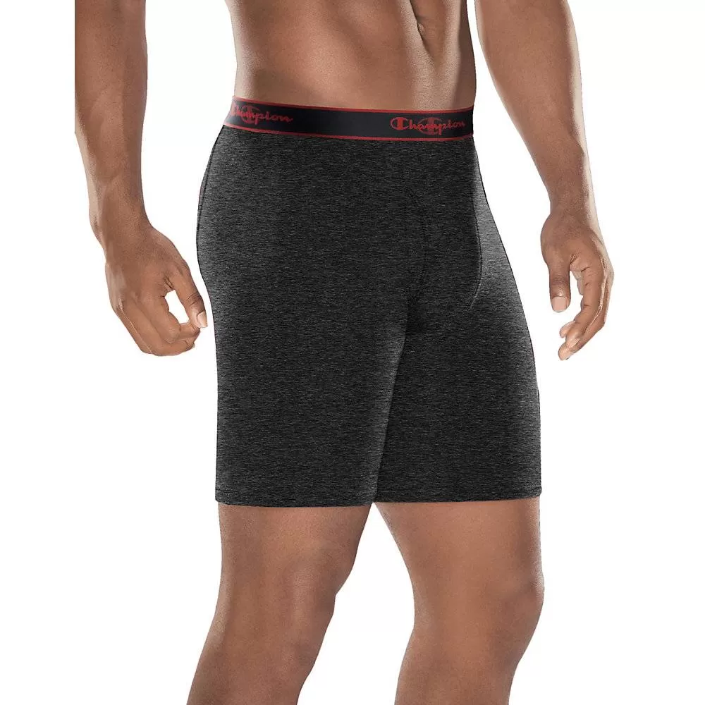 Lightweight, quick drying long leg Boxer Briefs are comfortable for all-day wear or workouts and help you maintain your optimal temperature. Champion Vapor technology adjusts the rate of evaporation as temperature changes. Designed to accelerate and slow cooling based on temperature, activity & environment. Moisture wicking fabric waistband keeps you cool and dry. Contrast color Champion logo waistband. No-ride up fit. Smooth flat seams prevent chafing. Convenient 3-pair pack.