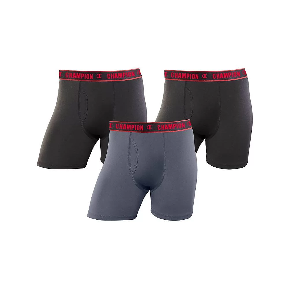 Information:Wicking Performance Boxer Briefs are comfortable for every day wear or workouts. Champion Vapor technology with X-Temp dries faster as your body heat rises so you can always keep your cool. Features FreshIQ® advanced odor protection technology that helps underwear resist odor. Moisture-wicking fabric moves with you and keeps sweat away from skin. Exposed Champion logo waistband. No-ride up fit stays in place. Smooth flat seams won't irritate. Self fabric front pouch with fly. Regular length with hemmed legs. Convenient 3-pair pack.