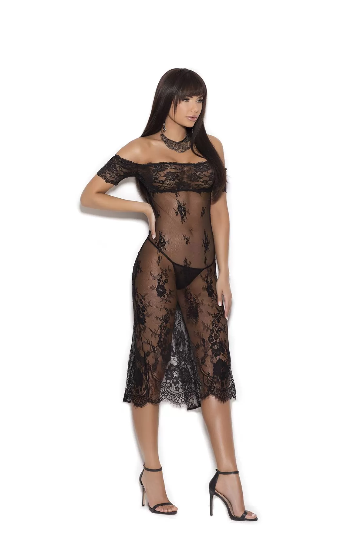 Information:Off the shoulder tea length lace gown with eyelash lace hem, back slit and back zipper.