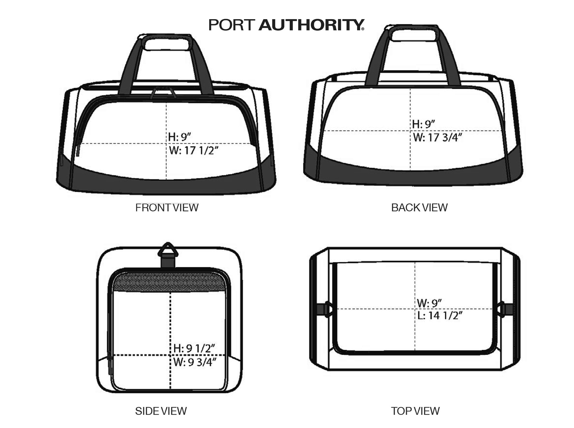 Information:Sized to fit the gear you need to be active, this duffel also has several pockets to keep things organized. A lined, padded bottom gives this durable bag structure and protection. 600 denier polyester canvas, contrast ripstop accents, abrasion and water-resistant coated bottom Large decoration-friendly front zippered pocket Zippered end pocket with exterior stretch mesh pocket Zippered end pocket with gusseted shoe, ball or equipment pocket with mesh for ventilation Webbing zipper pulls with contrast stitching for visibility Padded handle Adjustable, detachable shoulder strap with no-slip pad Dimensions: 12'h x 26'w x 12'd; Approx. 3,745 cubic inches Note: Bags not intended for use by children 12 and under. Includes a California Prop 65 and social responsibility hangtag.
