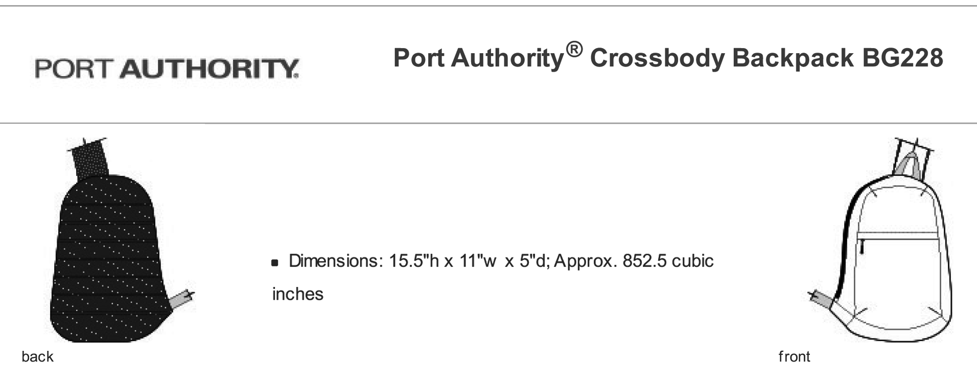 Information: 300D polyester twill Unisex design Zippered main compartment Padded slip tablet or notebook pocket Front zippered pocket Crossbody strap for versatile carrying options Adjustable, quick-release buckle strap Padded air mesh strap and back panel Ergonomic micro dot zipper pulls Dimensions: 15.5'h x 11'w x 5'd; Approx. 852.5 cubic inches Note: Bags not intended for use by children 12 and under.