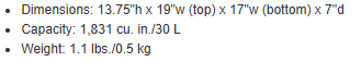 Information: Smooth matte polyester with knitted cloth Zippered main compartment Dyed-to-match metal zipper pulls Front zippered pocket Dyed-to-match molded zippers Over-the-shoulder length webbing handles Luggage trolley pass through on back Dimensions: 13.75'h x 19'w (top) x 17'w (bottom) x 7'd Capacity: 1,831 cu. in./30 L Weight: 1.1 lbs./0.5 kg Note: Bags not intended for use by children 12 and under.